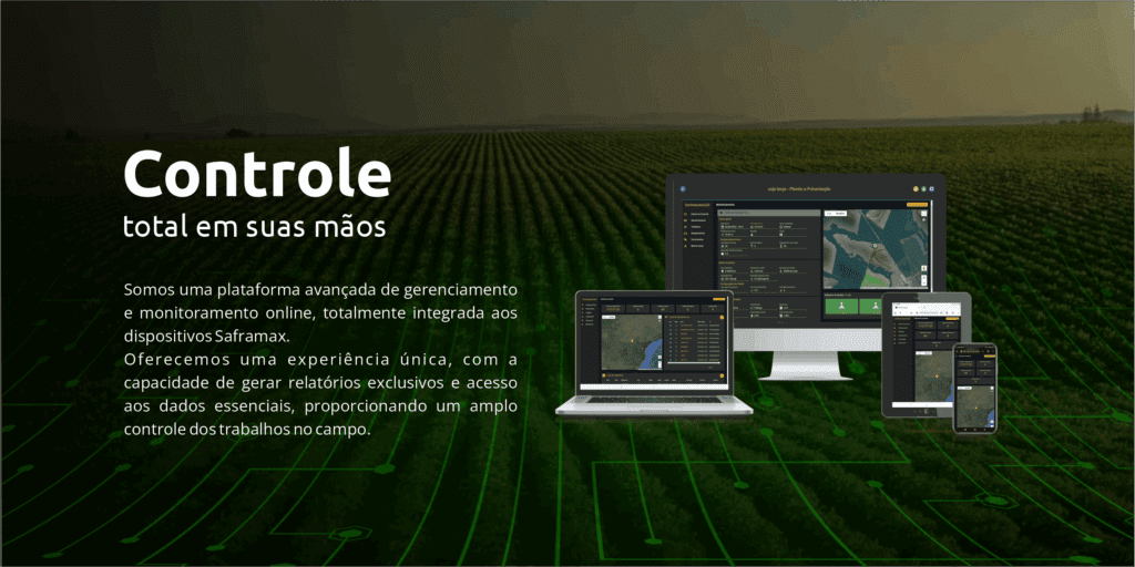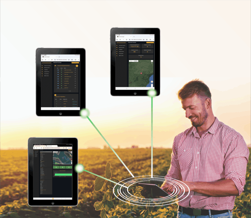 Integração completa: Sincroniza com equipamentos Saframax, permitindo o acompanhamento detalhado de atividades como plantio e pulverização.